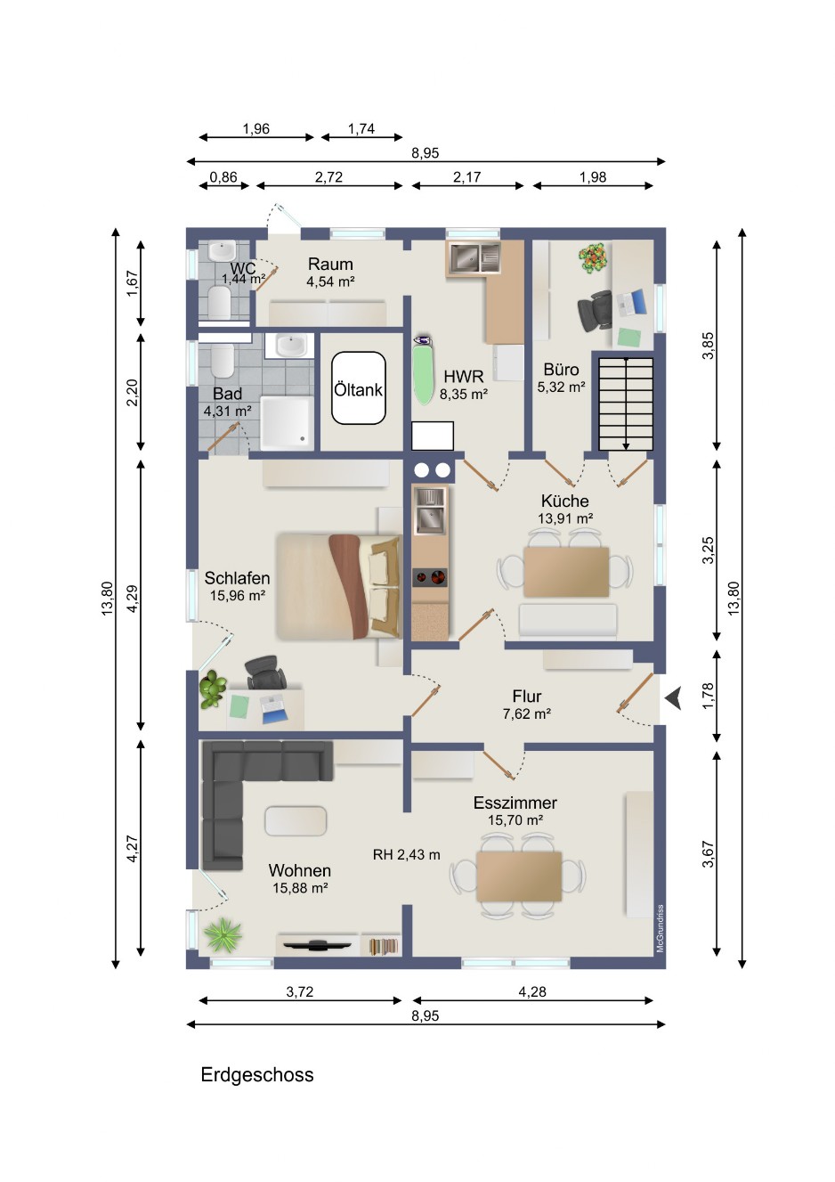 Es stehen Ihnen im Erdgeschoss ein geräumiges Wohn- und Esszimmer mit davorliegender Terrasse und Blick in den schönen Garten, einen Küchenbereich mit Einbauküche, sowie ein Duschbadezimmer und ein Gäste-WC, ein Büro und zwei Hauswirtschafträume zu Verfügung.
